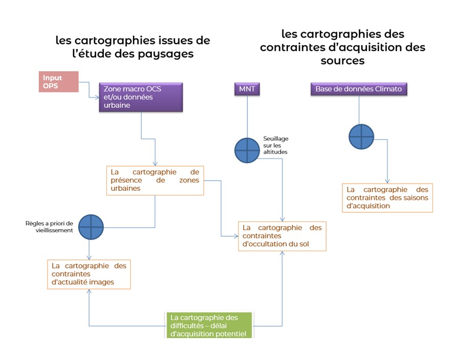 Différentes cartographies maillées (maille variable selon les zonages de 1km² à 100 km²) sont mises en place : les zones urbaines, les contraintes d’occupation du sol, les saisons d’acquisition et les contraintes d’actualité ont été établies sur plus de 70 millions de kilomètres carrés.