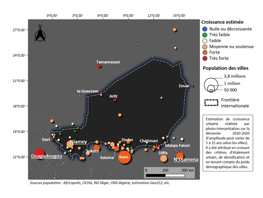 Pour le lot 1, un premier niveau macroscopique couvrant toutes les zones frontalières a permis de présenter une sélection de 71 villes pour lesquelles ont été produits des indicateurs de croissance (Figure 1 Exemple de cartographie produite en analyse niveau 1). Un second niveau a permis d’approfondir plusieurs zones d’intérêt fort retenues par les Douanes, pour lesquelles ont été analysés l’évolution de différentes localités et des points d’accès frontaliers et des axes routiers situés à proximité des unités de douane (Figure 2 Exemple d’illustrations produites en analyse niveau 2).