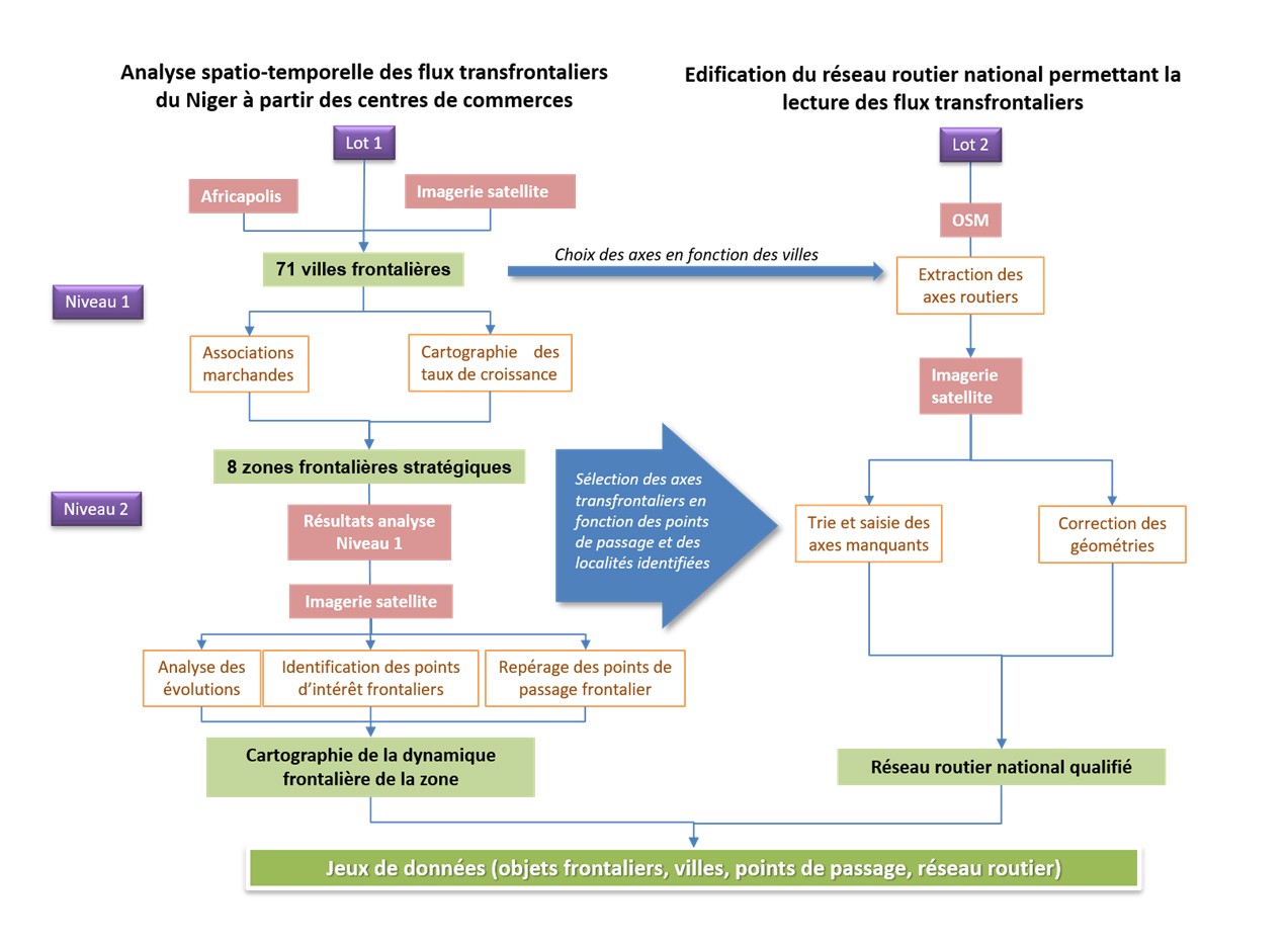 L’étude s’articule en deux lots (lot 1 : analyse des centres de commerce et lot 2 : analyse et production du réseau routier) et en deux niveaux de détail. Elle s’appuie sur une recherche bibliographique transverse, sur des informations capitalisées par Geo212 sur la zone, de la photo-interprétation sur l’imagerie satellitaire (HR Sentinel et THR Maxar/SecureWatch principalement), des données cartographiques disponibles en open sources et celles fournies par la Direction Générale des Douanes. Voir le schéma